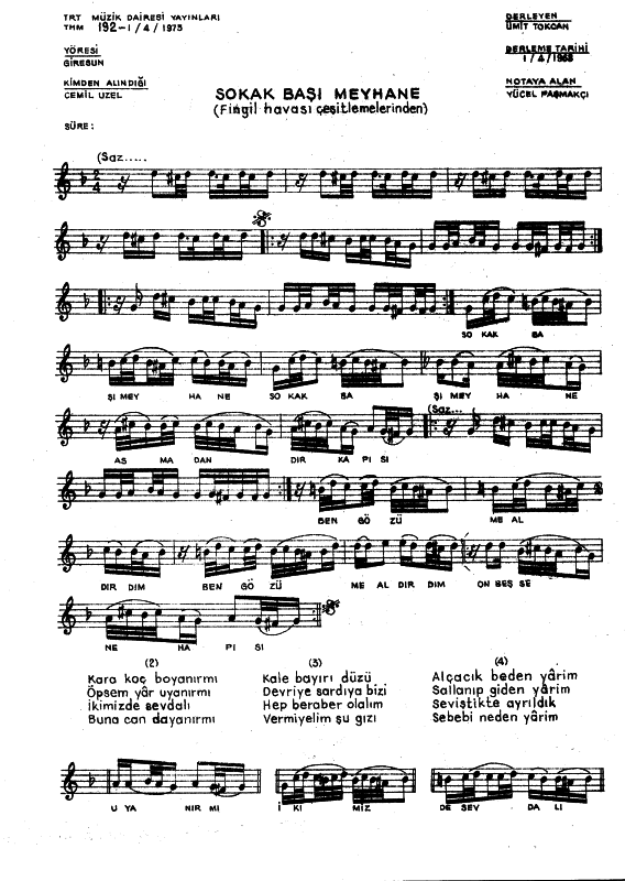 Sokak Basi Meyhane Notalar Sozleri